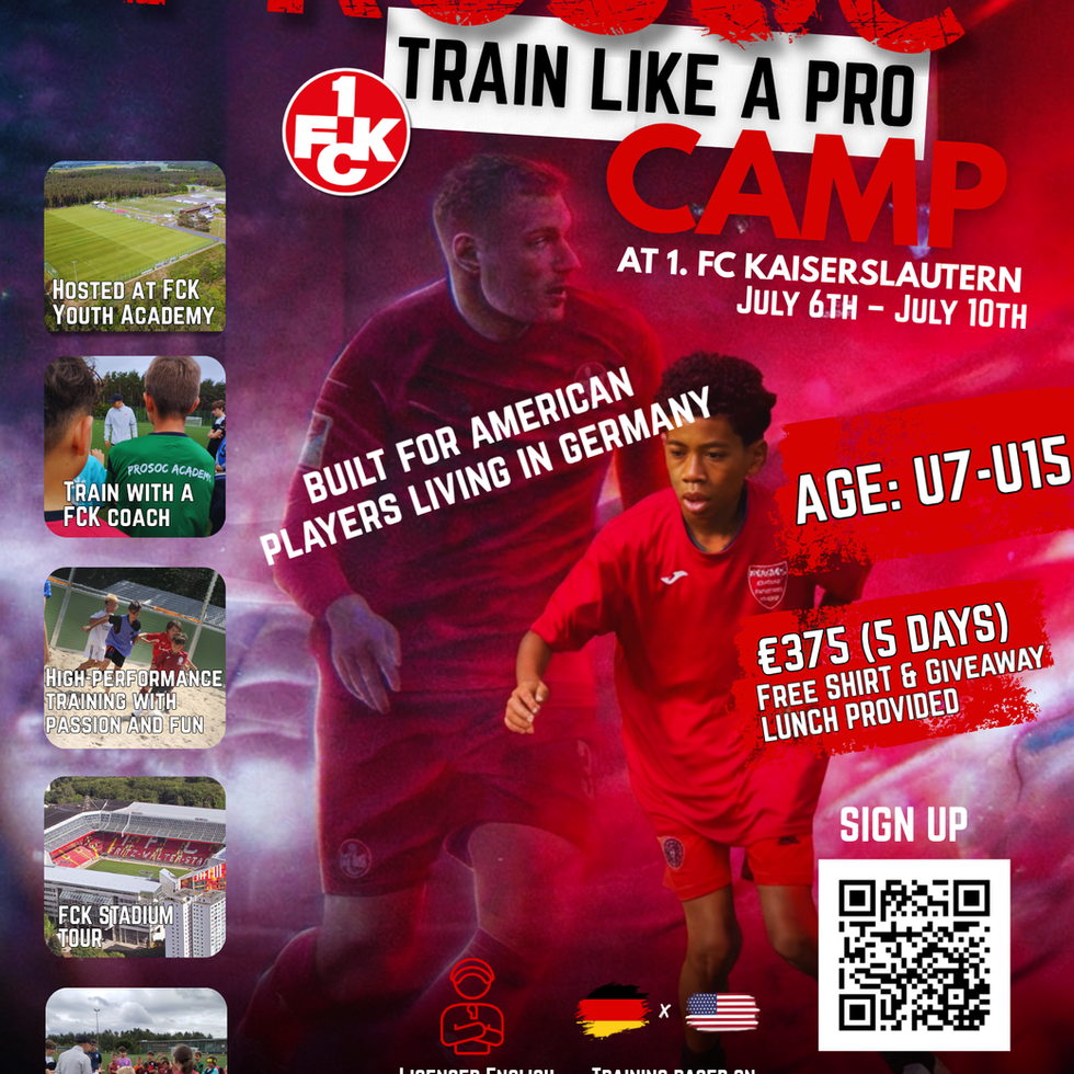 The ProSoc Train Like a Pro Camp is a five-day, full-day, high-performance experience that gives participants the feel of academy-level training, all led by our licensed ProSoc coaches. While campers won’t be training with F.C. Kaiserslautern players, the program mirrors the professional academy environment in structure, intensity, and daily routine.